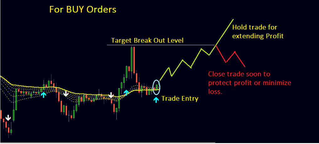 For a Buy order: Once the price breaks out ABOVE a weak resistant zone (target breakout level), EA will hold the position for extending profit further.
