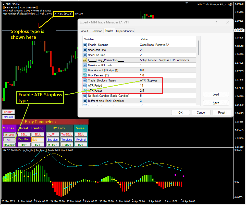 To set up ATR parameters, let’s press F7 to open EA properties, and input the period and factor as your strategy. Traders can enable this option by either first select Trade_Sloploss_Type as “ATR_Stoploss” in EA properties OR simply click on “ATR” button in the Entry Parameters Dashboard as in above screenshot.