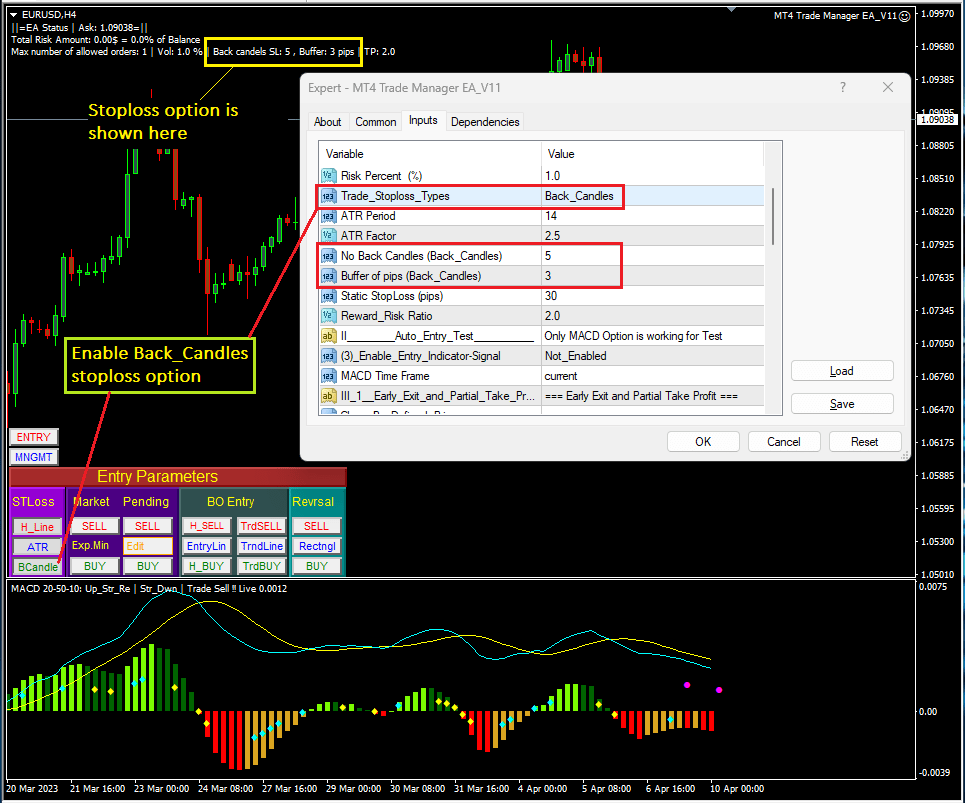 MT4 Trade Manager EA provides 04 methods to setup stoploss for a trade including stoploss line, ATR stoploss, “back candles” stoploss and fixed stoploss value. Traders can set up these parameters on EA’s properties or via Entry Dashboard on chart.