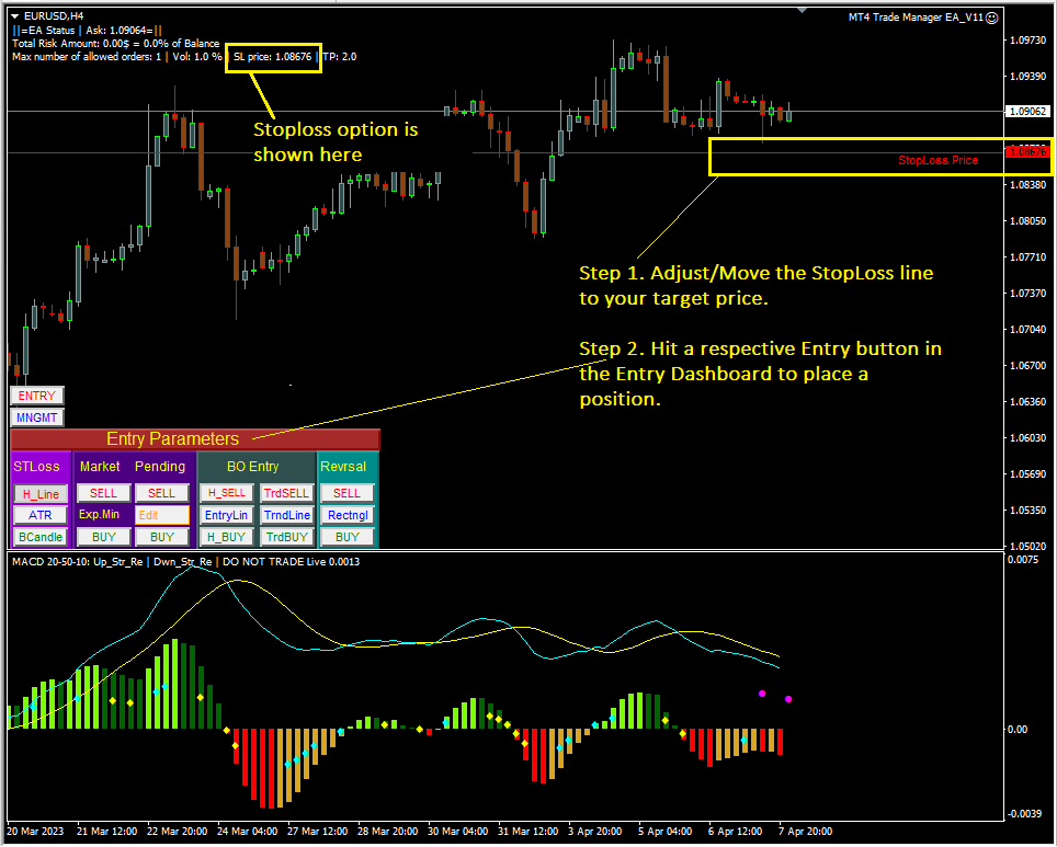 Then, the EA will automatically draw a red horizontal line (stoploss line) on chart, traders adjust the line to a target stoploss price, then hit an Entry Button in the yellow box as shown above screenshot. When a position is placed, a stoploss will be set right at the red horizontal line with a respective volume setup in Risk Management section.