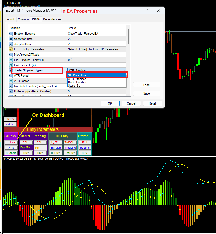 This is the most useful method to place a stoploss. Traders can enable this option by either first select Trade_Sloploss_Type as “SL_Price_Line” in EA properties OR simply click on “H_Line” in the Entry Parameters Dashboard as in above screenshot.